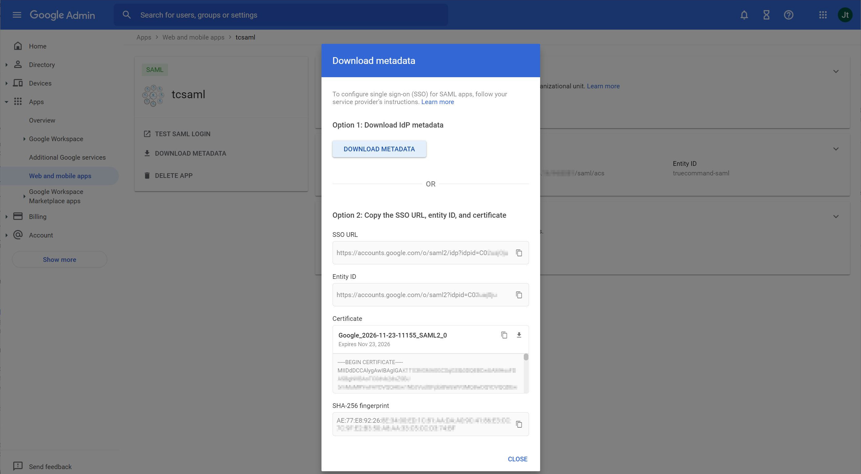 Configuring TrueCommand SAML Service for Google Admin