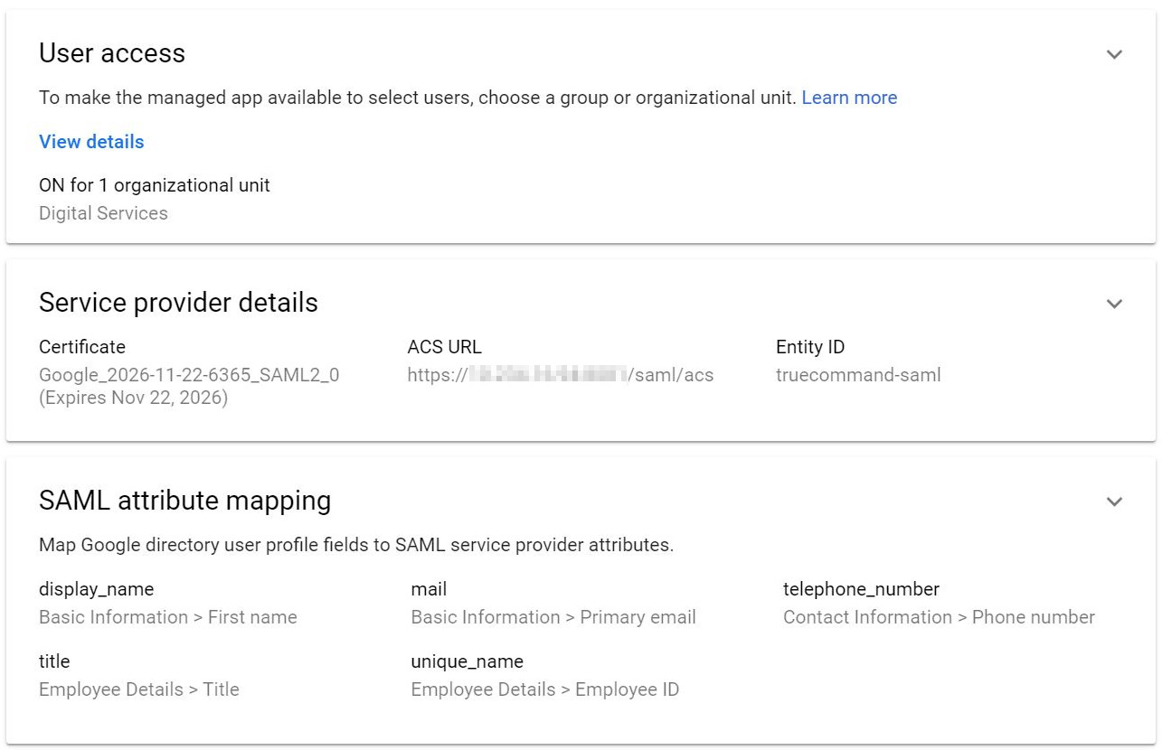 After you configure SAML in Google Admin, you configure and start the TrueCommand SAML service.